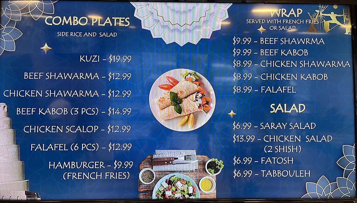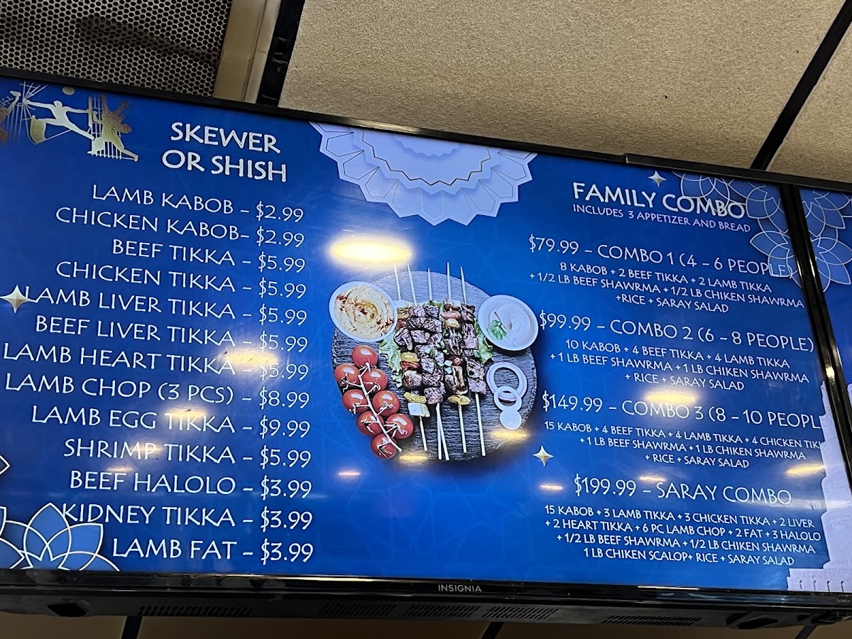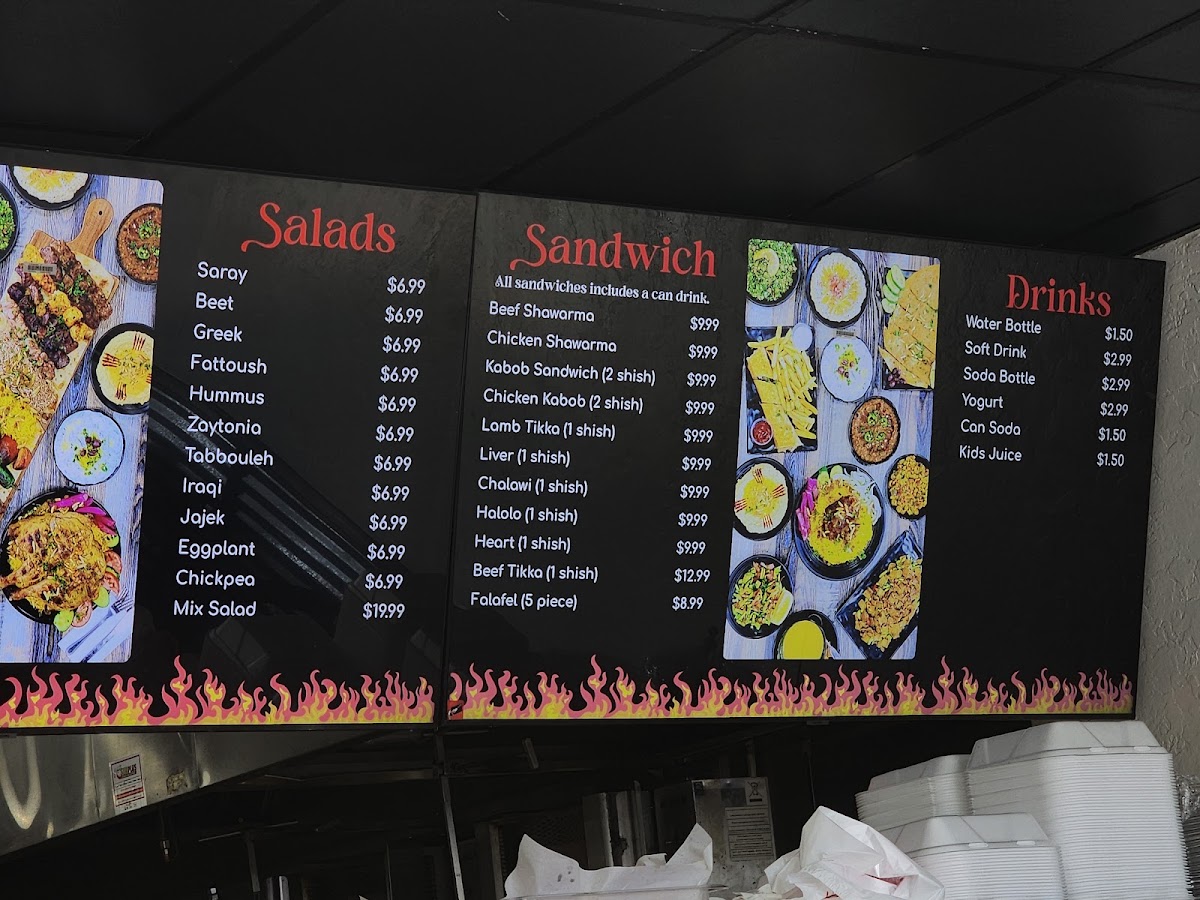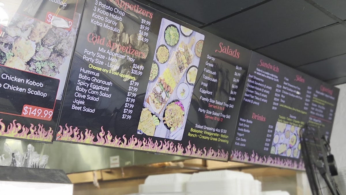 Welcome to Saray Restaurant Charcoal Grill, where the tantalizing aromas of expertly grilled meats and rich, authentic flavors transport you straight to the heart of Middle Eastern cuisine. Located at 123 Jamacha Rd, El Cajon, CA, our menu boasts an array of mouthwatering specialties that you simply can't miss. Dive into our succulent Kebabs, savor the unique spices of our Arayis Kabob, or indulge in a hearty Beef Kebab Dinner. Don't forget to share some Pita and Hummus as you explore our Chicken Tikka Wrap and Shawarma Chicken. Each dish is a celebration of flavor, from our diverse Mix Grill to the comforting taste of Arabic Tea. Whether you're craving the rich Beef Shawarma or the delightful Liver Shish Kafta Kabob, your taste buds are in for a treat. With highlights like our famous حمص بطحينة اعداد الشيف كرم and the delicious قوزي عراقي, every meal at Saray promises to be an unforgettable dining experience. Come with friends and family, and discover why we pride ourselves on offering the best food in El Cajon!